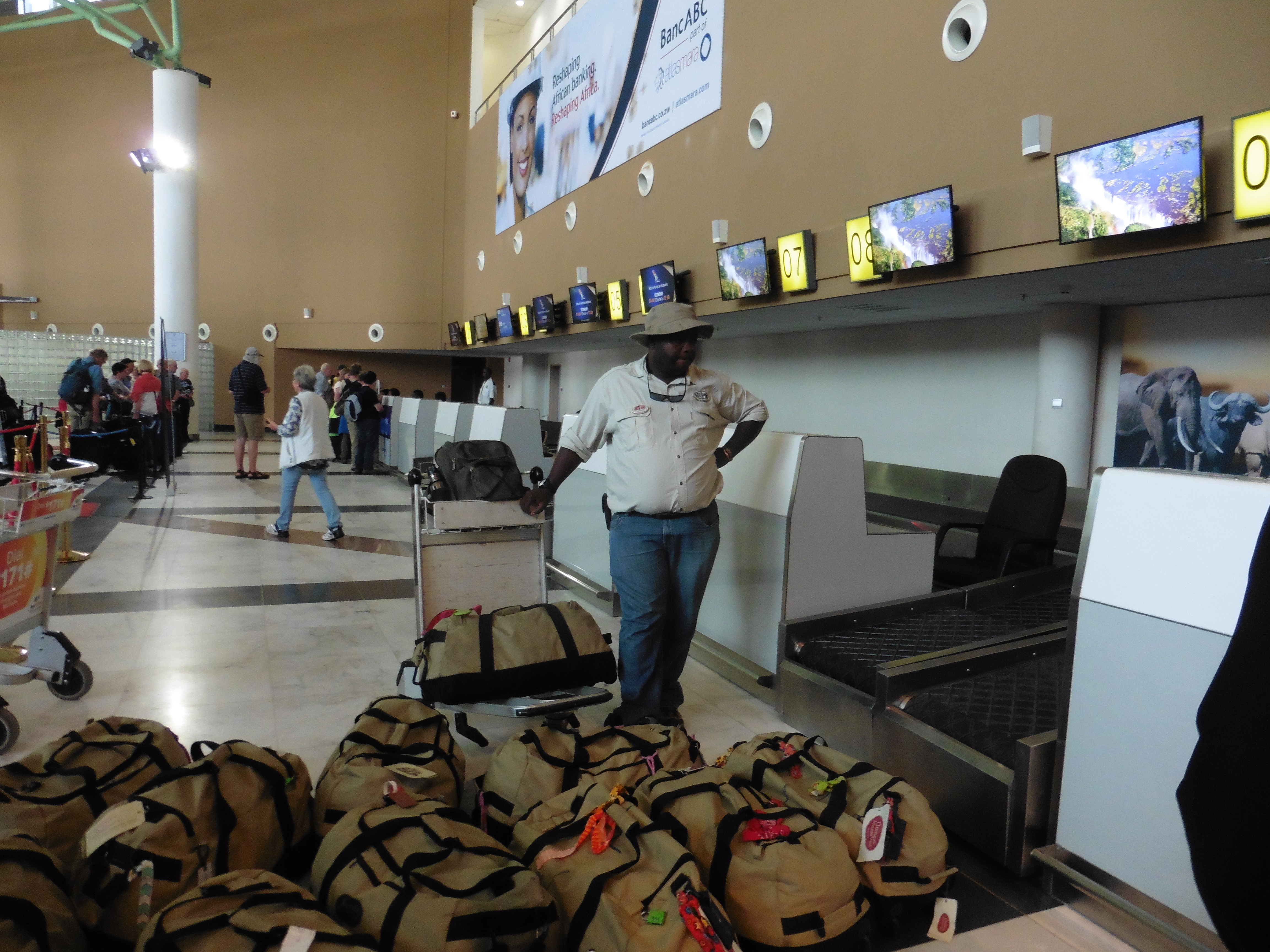 At the airport Phanuel, our wonderful trip leader, relinquished his responsibility for our bags. At the start of our trip, he told us they were his babies and he would make sure they got safely from camp to camp.